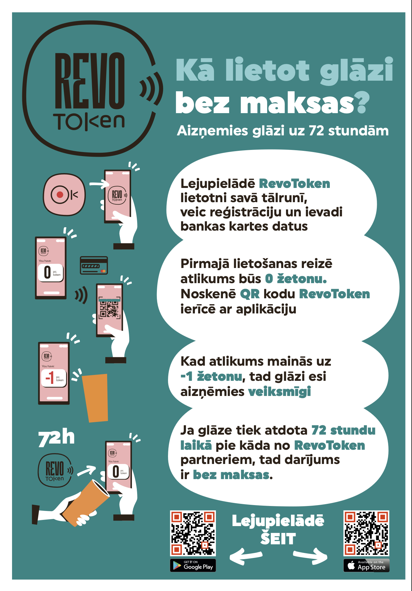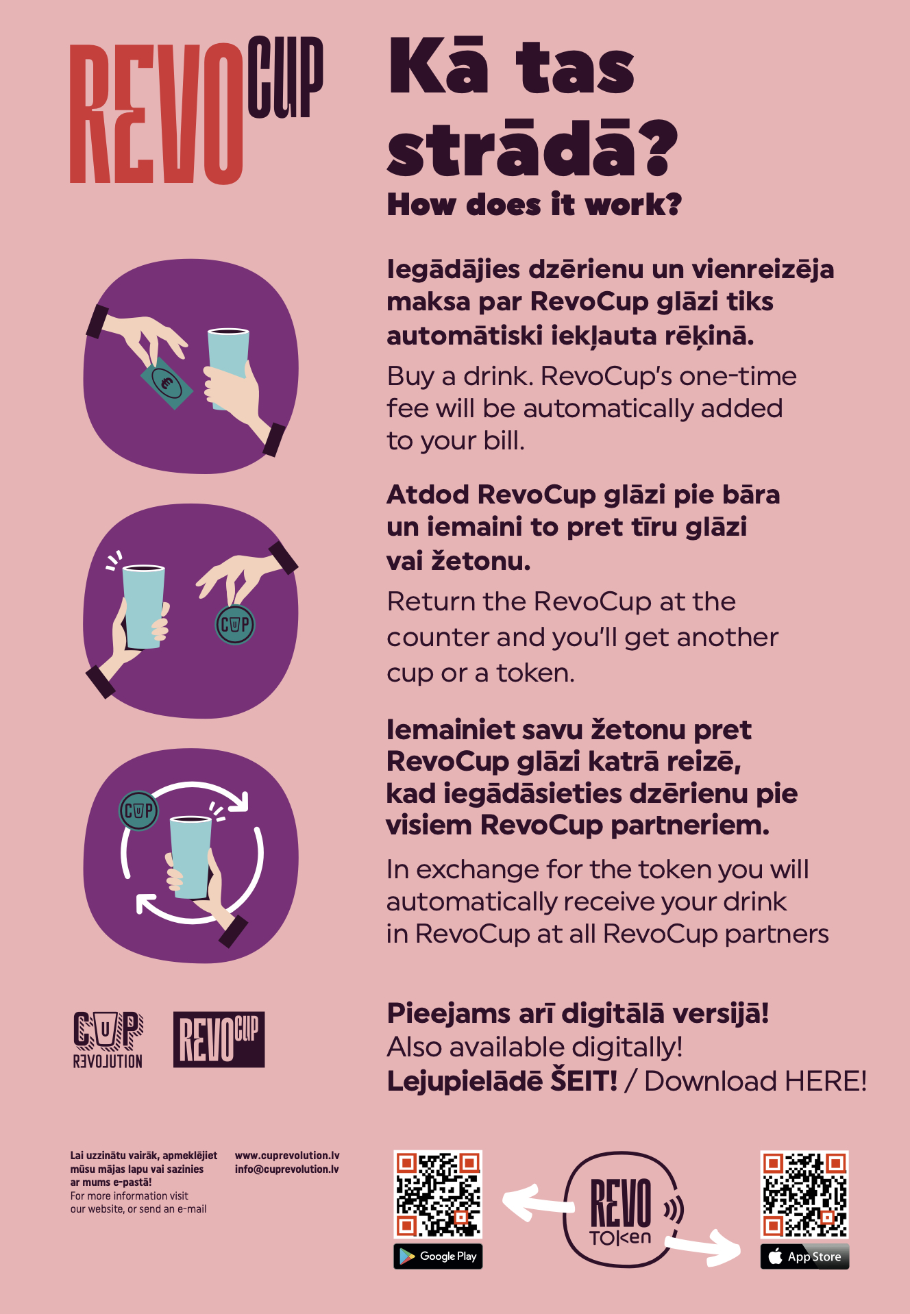 1) pērkot dzērienu, iegādājies glāzi (2 eur) un vēlāk vari to samainīt pret citu glāzi vai žetonu, kuru varēsi izmantot citā reizē. Nododot glāzi, saņemsi RevoCup žetonu, ko varēsi apmainīt pret jaunu glāzi jebkurā bārā vai citā pasākumā, kurā darbojas RevoCup glāžu sistēma. Uzstādot mobilo RevoToken aplikāciju žetonus var glabāt arī digitāli, lai nav jāsatraucas par to nēsāšanu līdzi. Žetonu nevar apmainīt pret naudu!